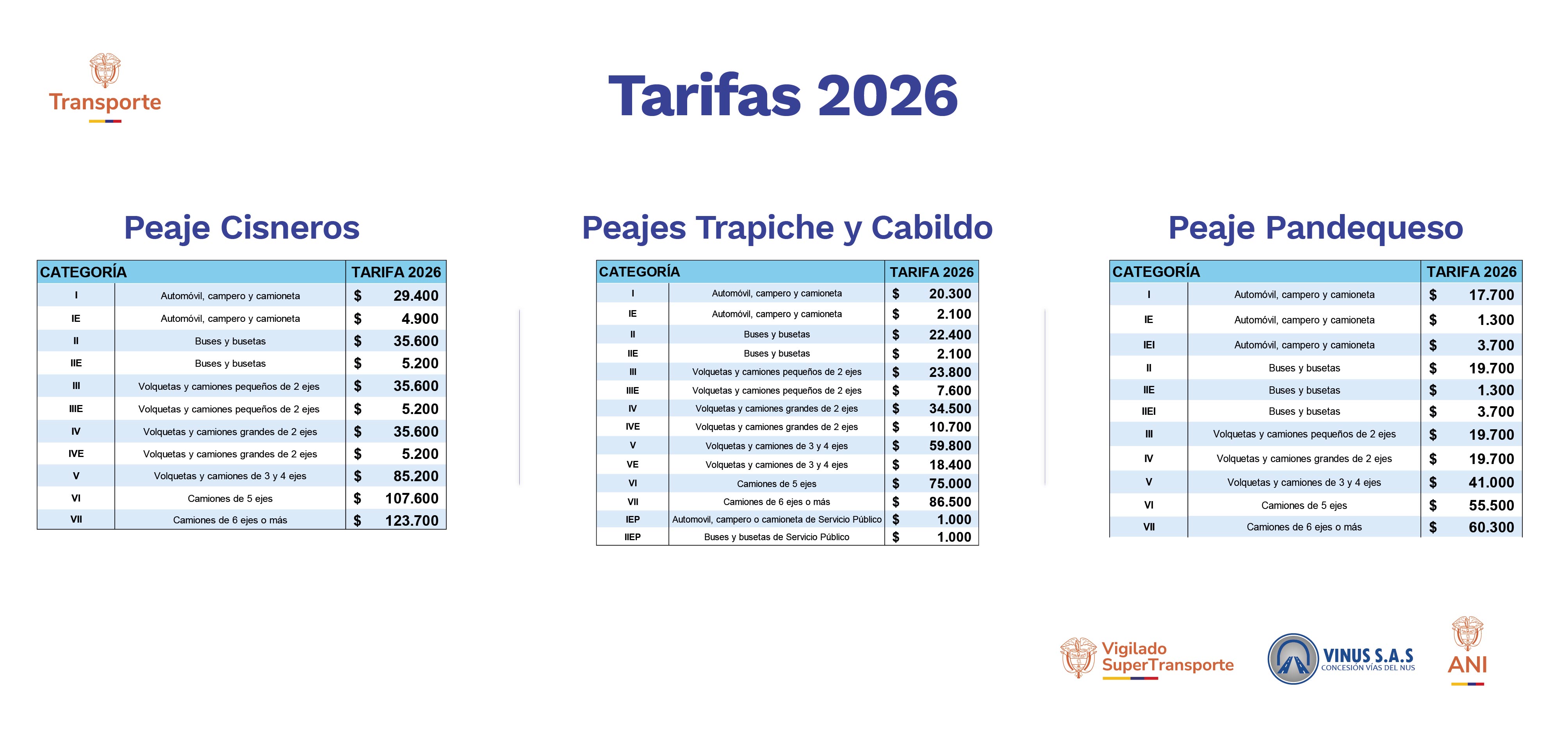 Cumpliendo lo resuelto por el Ministerio de Transporte en la Resolución de Peajes vigente No. 20253040026425 del 07 de julio de 2025, desde el 16 de enero de 2026 rigen las nuevas tarifas en las estaciones de peaje Cisneros, Pandequeso, Trapiche y Cabildo.